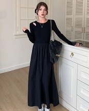 ロング丈ワンピース Aライン フリーサイズ モダン ワンピース フロントカット ブラック 長袖 秋冬 シンプル レディース 大人 カジュアル きれいめ 韓国ファッション