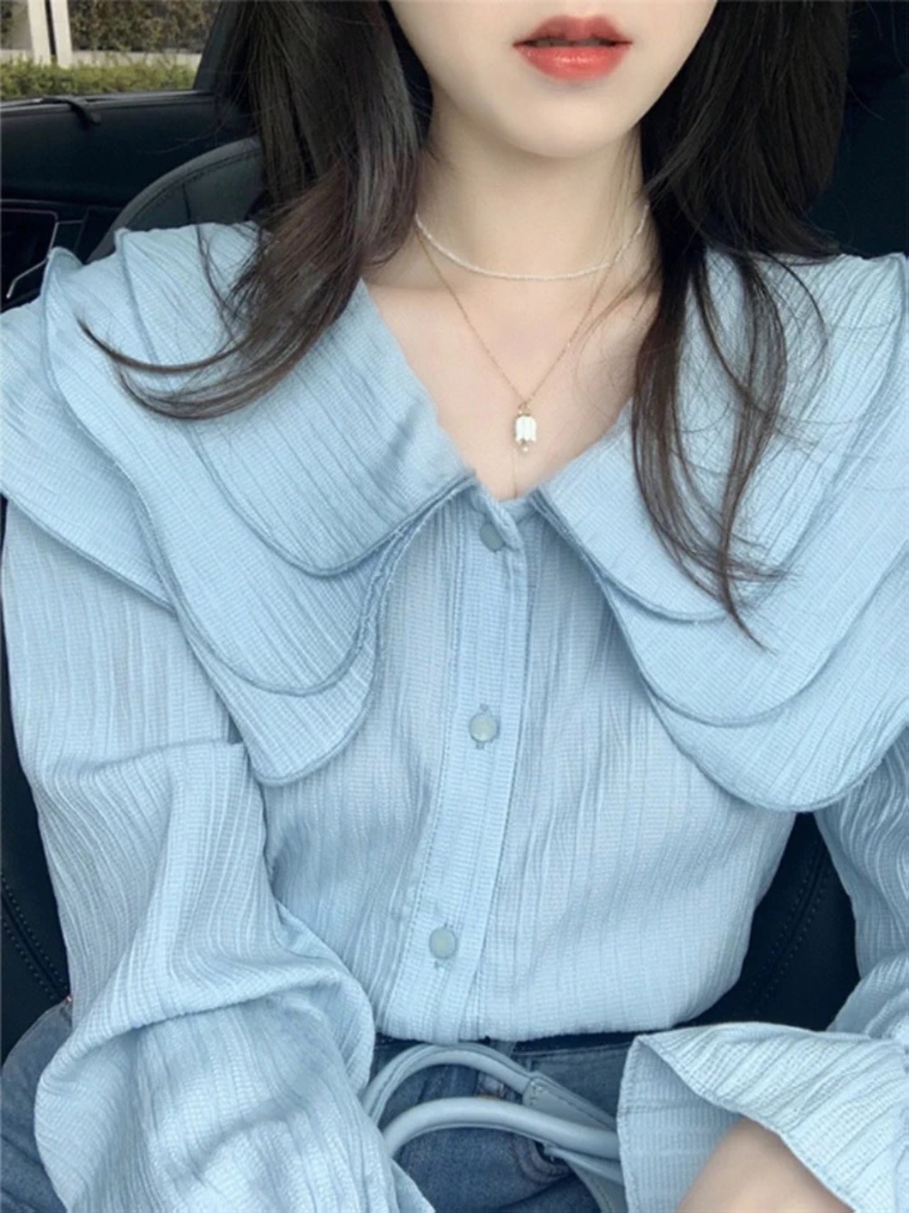 セーラーカラーシャツ ブラウス バルーン袖 フリル キャンディースリーブ ワッシャーブラウス トップス 春 ブルー レディース 大人 カジュアル きれいめ 韓国ファッション 連番10
