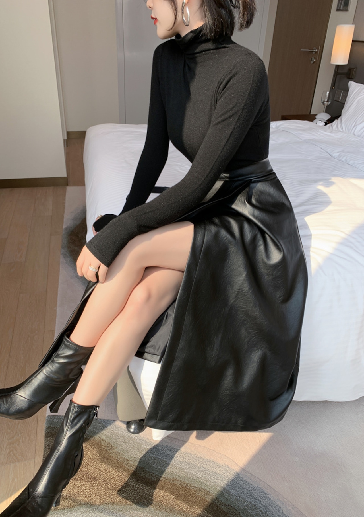 レザースカート フェイクレザー スカート ハイウエスト スリット フレアスカート ラップ風スカート ロングスカート セクシー カジュアル 韓国